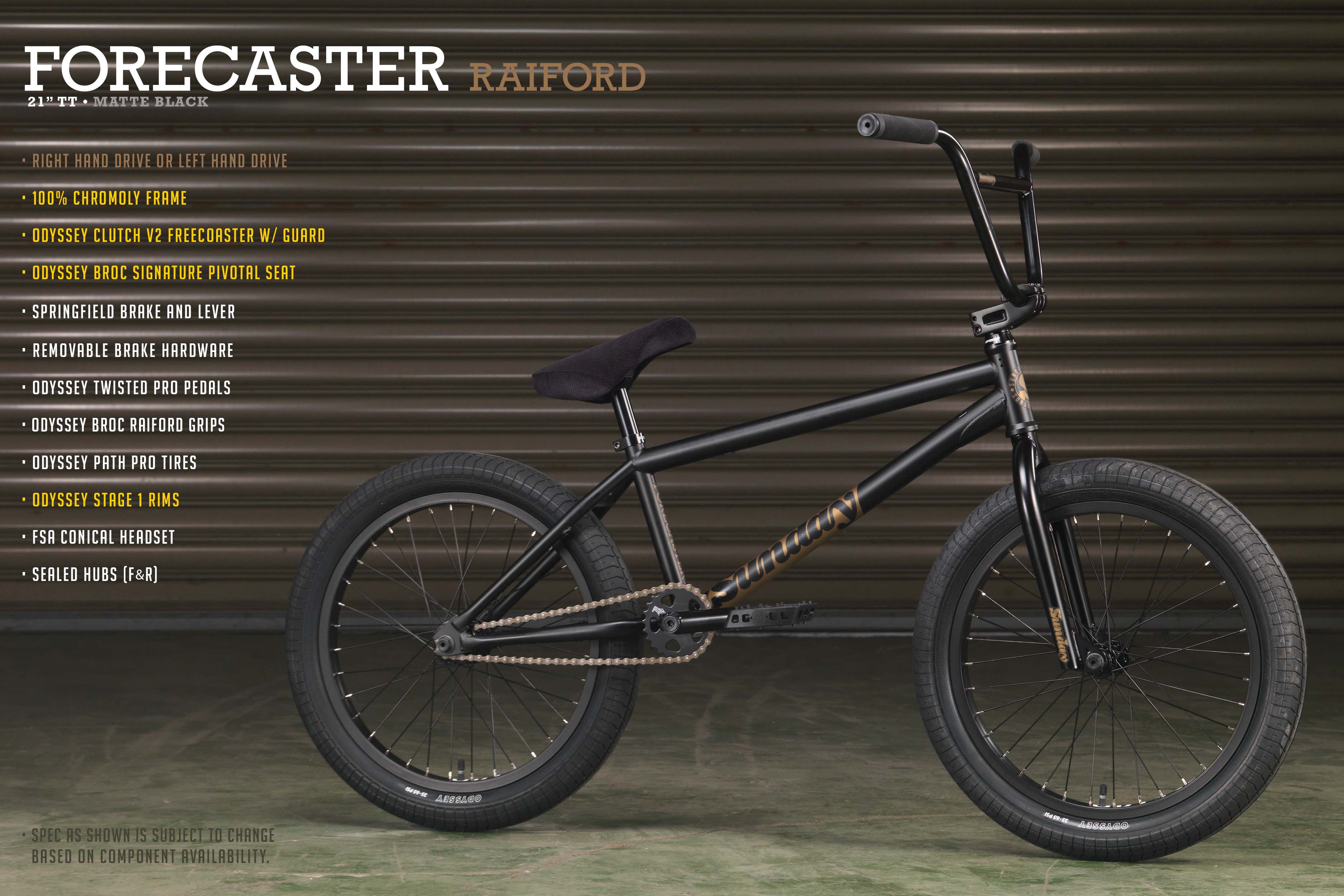 Broc Raiford is Sunday's newest pro and with that comes his brand new new signature Forecaster. You’ll find Signature spec’d design cues like the Odyssey BrocSignature Grips, combined with incredible parts like a Odyssey Clutch v2 Freecoaster hub, Odyssey Twisted Pro pedals, and Path Pro tyres.